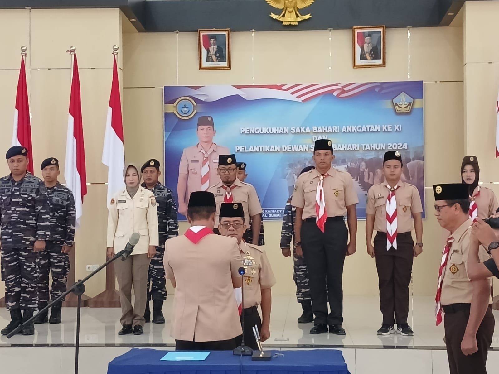 Komandan Lanal Dumai kak Kolonel Laut (P) Kariady Bangun selaku Ketua Majelis Pembimbing Satuan Karya Pramuka (Mabisaka) Bahari Daerah Riau melantik Pimpinan Satuan Karya Pramuka (Pimsaka) dan Dewan Saka Bahari Tingkat Kota Dumai di Mako Lanal Dumai, Jalan Yos Sudarso Nomor 01, Kelurahan Buluh Kasap, Kecamatan Dumai Timur, Kota Dumai, Sabtu (27/1/2024).