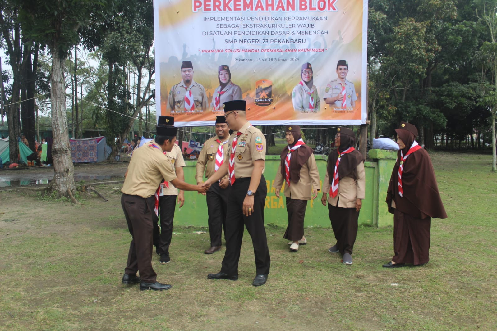 Ketua Kwarcab Kota Pekanbaru yang diwakili oleh Ketua Harian kak Toni Werdiansyah resmi membuka Kemah Blok Perdana SMPN 23 Pekanbaru di Markas Resimen Mahasiswa Indra Buana Universitas Riau yang digelar dari tanggal 16 s.d 18 Februari 2024.