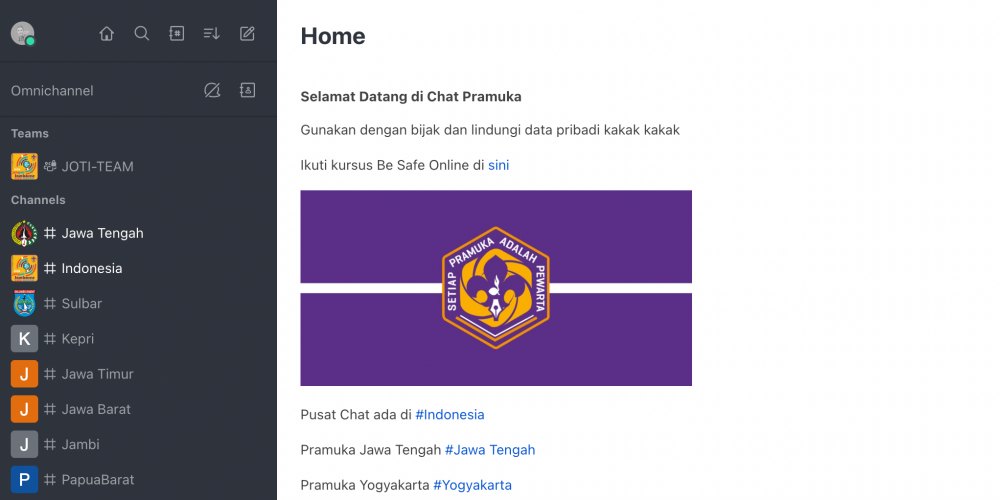 Dalam media Chat ini telah tersedia Channel-Channel setiap Kwartir Daerah yang bisa kakak ikuti dan juga Channel utama #Indonesia sebagai ruang bagi kita semua berbagi dan berdiskusi di sana.