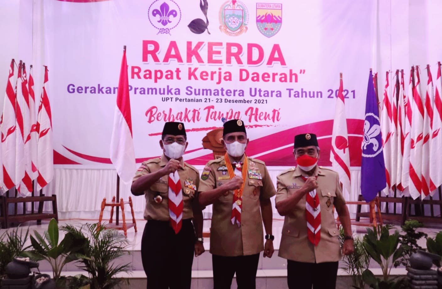 Wakil Ketua Kwarnas/Kakom Renbang, Kak Dr. Joko Mursitho M.Si, Ketua Kwarda Gerakan Pramuka Sumatera Utara, Kak H. Nurdin Lubis, dan Gubernur selaku Ketua Majelis Pembimbing Daerah Gerakan Pramuka (Kamabida) Sumatera Utara, Kak Edy Rahmayadi.