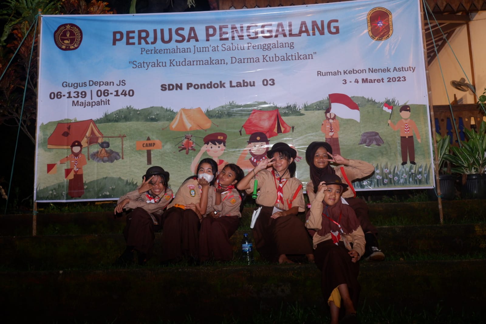 Perkemahan Jum’at Sabtu yang digelar oleh Gudep Majapahit pangkalan SDN Pondok Laabu 3, Jakarta Selatan di Rumah Kebon Astuti, Sawangan, Depok, Jawa Barat, 3-4 Maret 2023 dilaksanakan dalam suasana Ceria, Disiplin dan Bersahaja. Kecerian, Disiplin, dan Bersahaja yang merupakan tema dari kegiatan Perjusa ini terlihat pada visual-visual bderikut ini.
