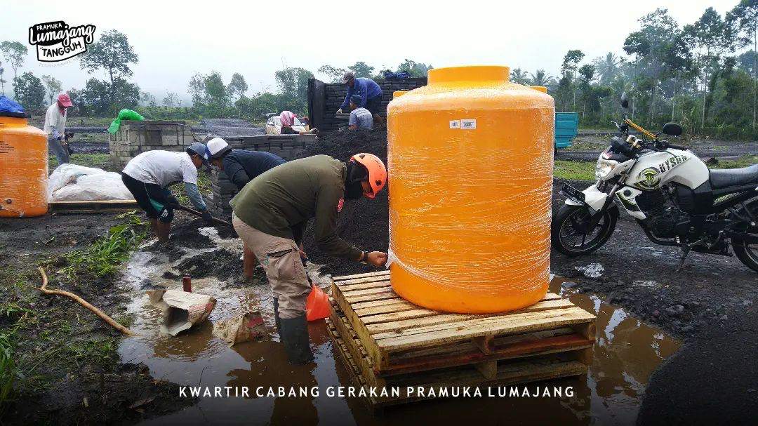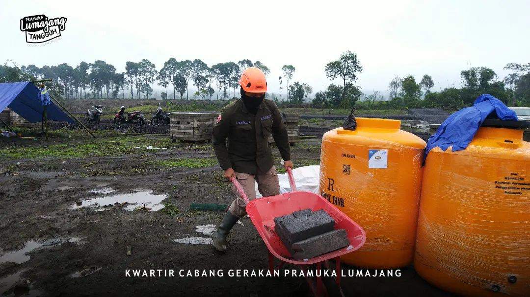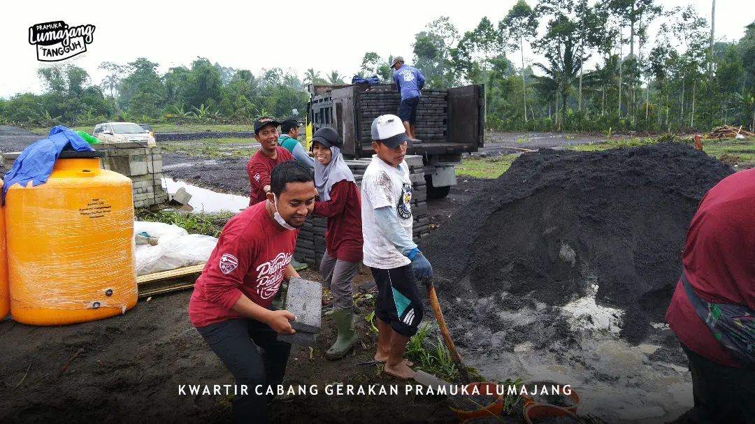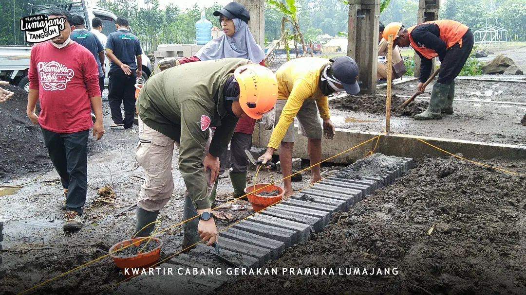 LUMAJANG — Sejumlah personil pramuka peduli mengawali pembangunan hunian sementara (huntara) yang pertama, bertujuan untuk mengukur waktu dan sebagai acuan kegiatan bakti Pramuka Peduli Gunung Semeru, Rabu (19/01/2022).