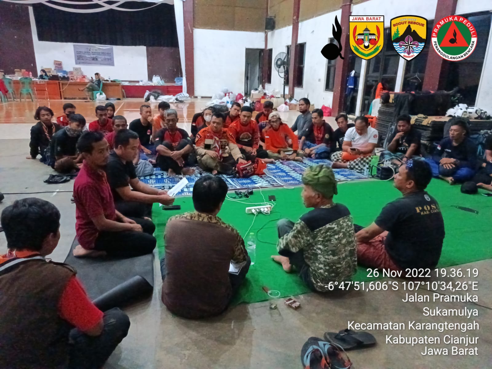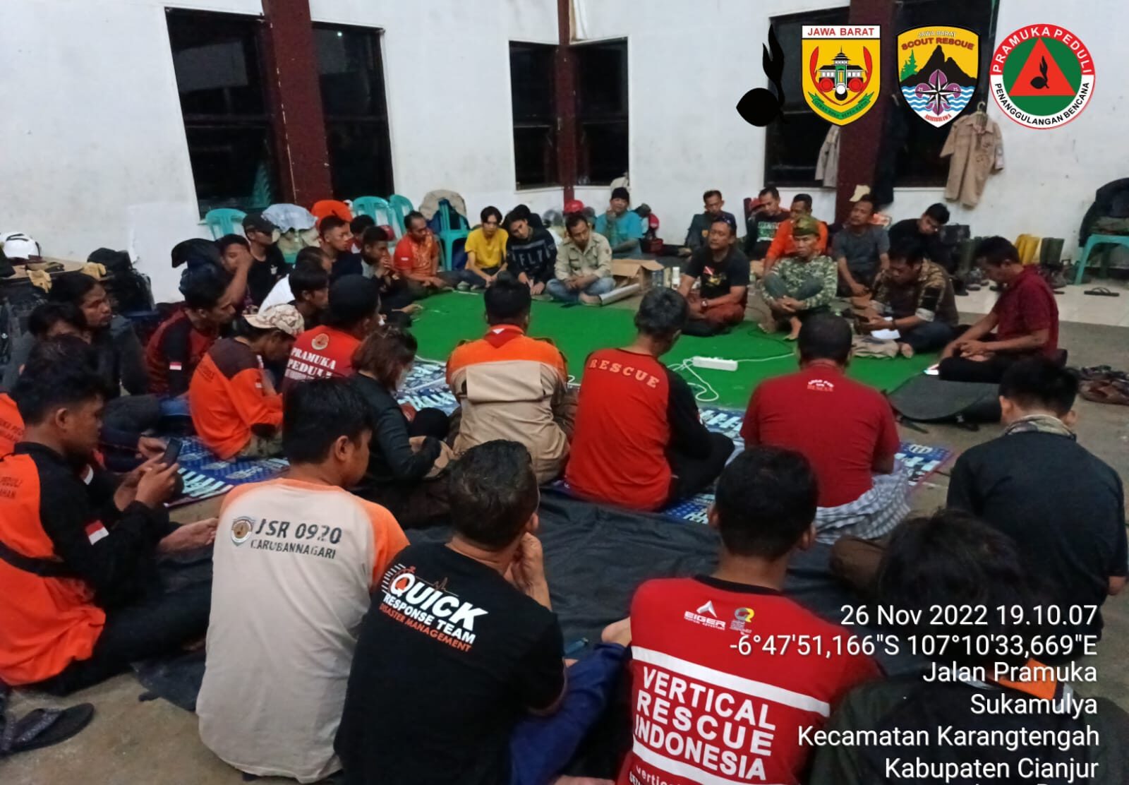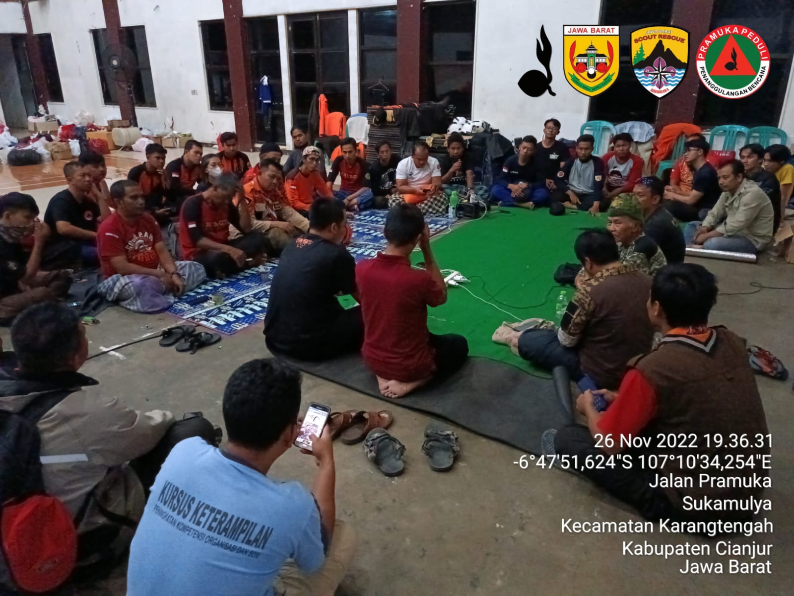 Waktu siang mencari dan evakuasi korban, malamnya terus melakukan evaluasi bagi seluruh relawan Pramuka yang tergabung di Pos Relawan Pramuka Peduli bertempat di Kantor Sekretariat Kwarcab Gerakan Pramuka Cianjur. Selain evaluasi yang telah dilaksanakan sekaligus juga merencanakan langkah kegiatan di hari berikutnya.