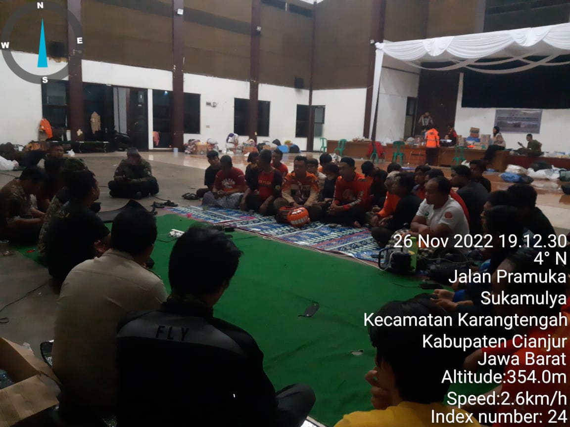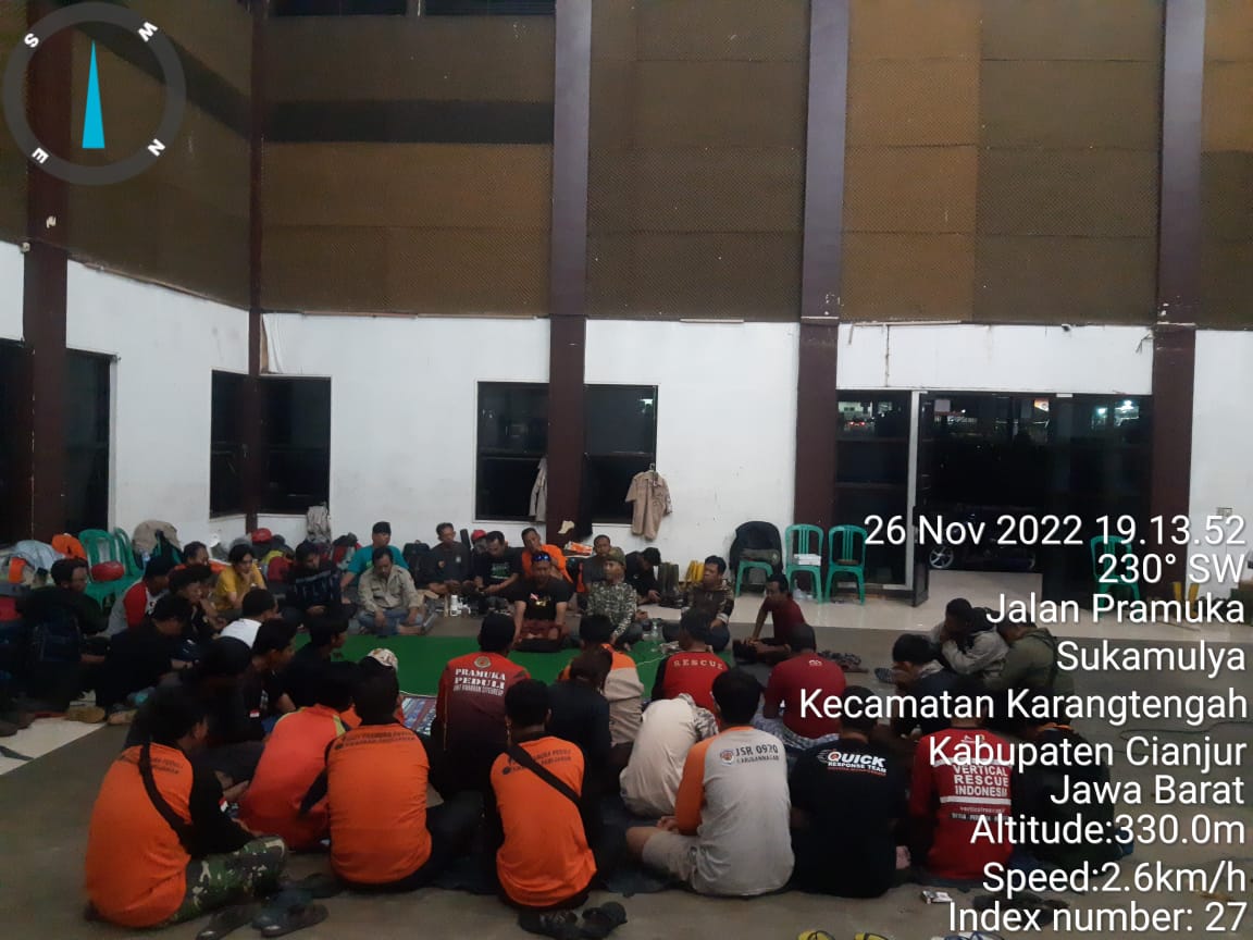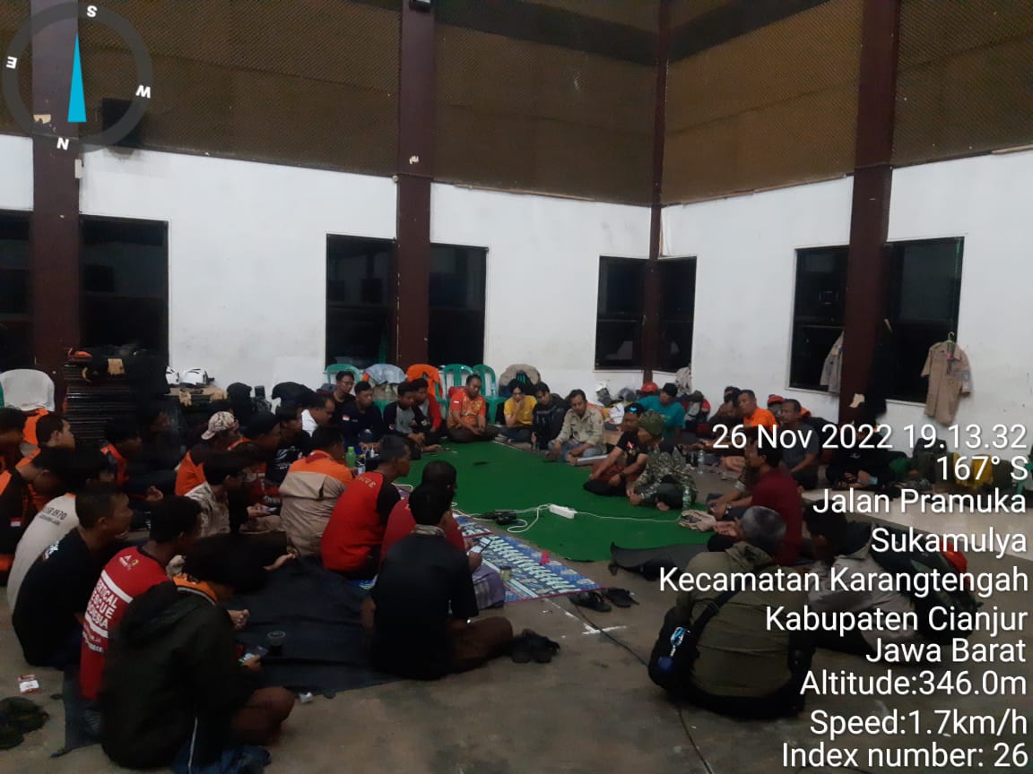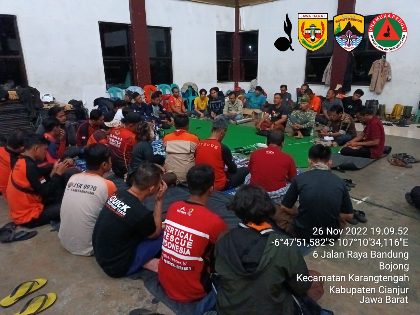 Waktu siang mencari dan evakuasi korban, malamnya terus melakukan evaluasi bagi seluruh relawan Pramuka yang tergabung di Pos Relawan Pramuka Peduli bertempat di Kantor Sekretariat Kwarcab Gerakan Pramuka Cianjur. Selain evaluasi yang telah dilaksanakan sekaligus juga merencanakan langkah kegiatan di hari berikutnya.