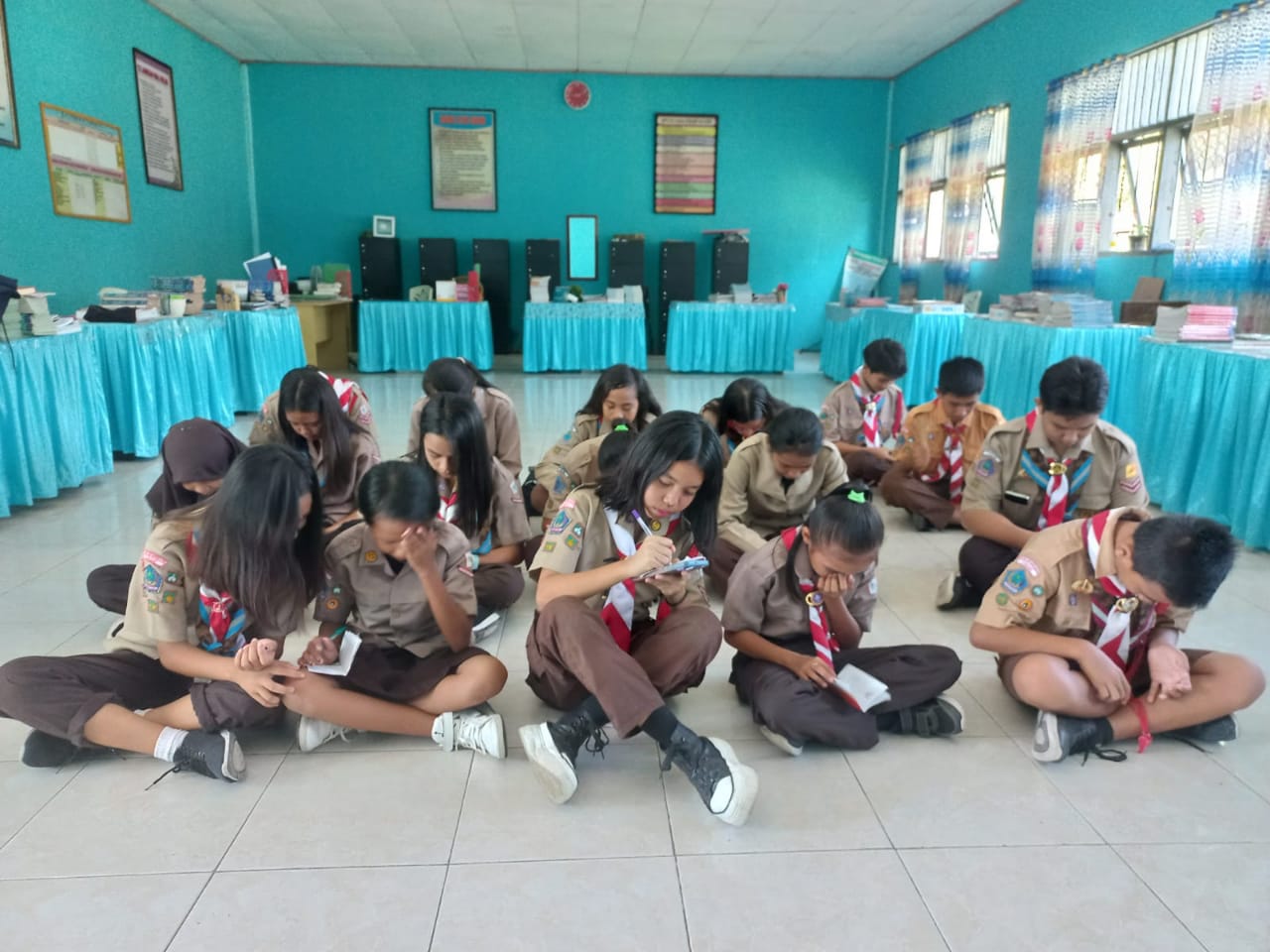 Selepas apel, seluruh siswa kelas 7 menerima materi tentang Sejarah Kepramukaan. Selama belajar, mereka dipandu oleh kakak-kakak Dewan Penggalang kelas 9.