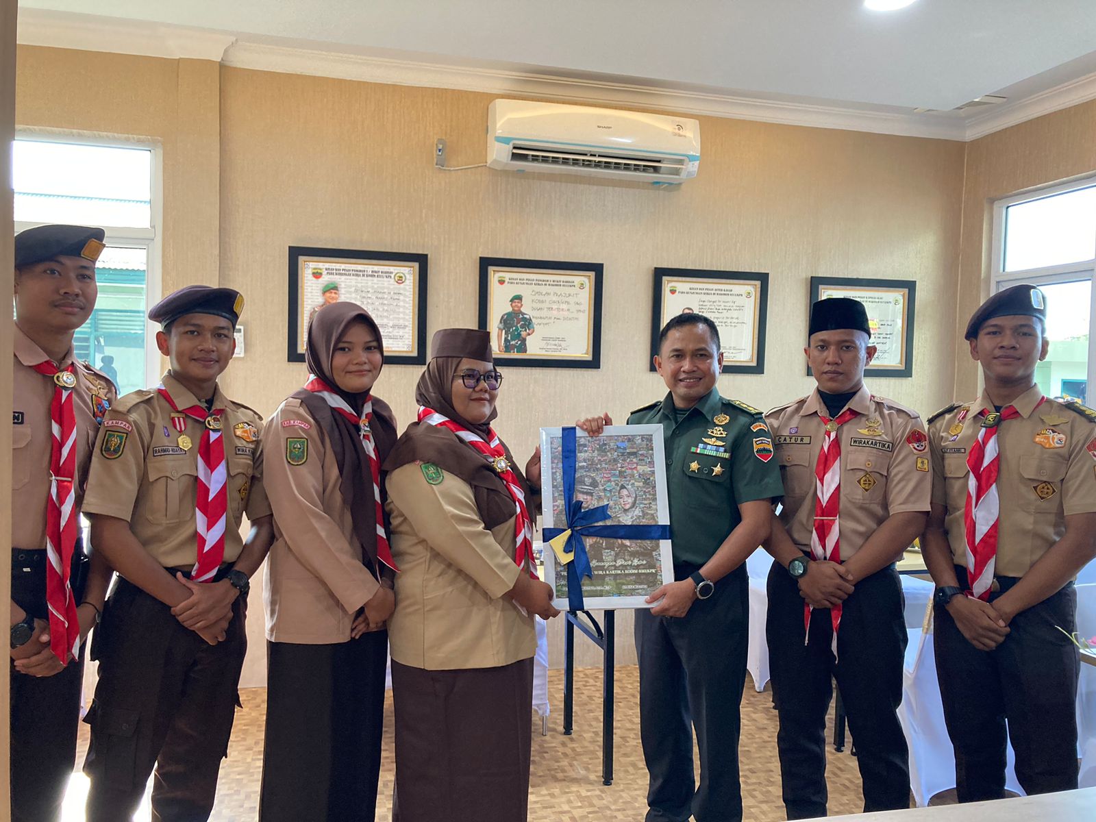 Tak lupa usai kegiatan, Saka Wira Kartika Kodim 0313/KPR diwakili anggota dan pamong saka memberikan cendramata berupa mosaik sebagai kenang-kenangan untuk kak Mulyadi.