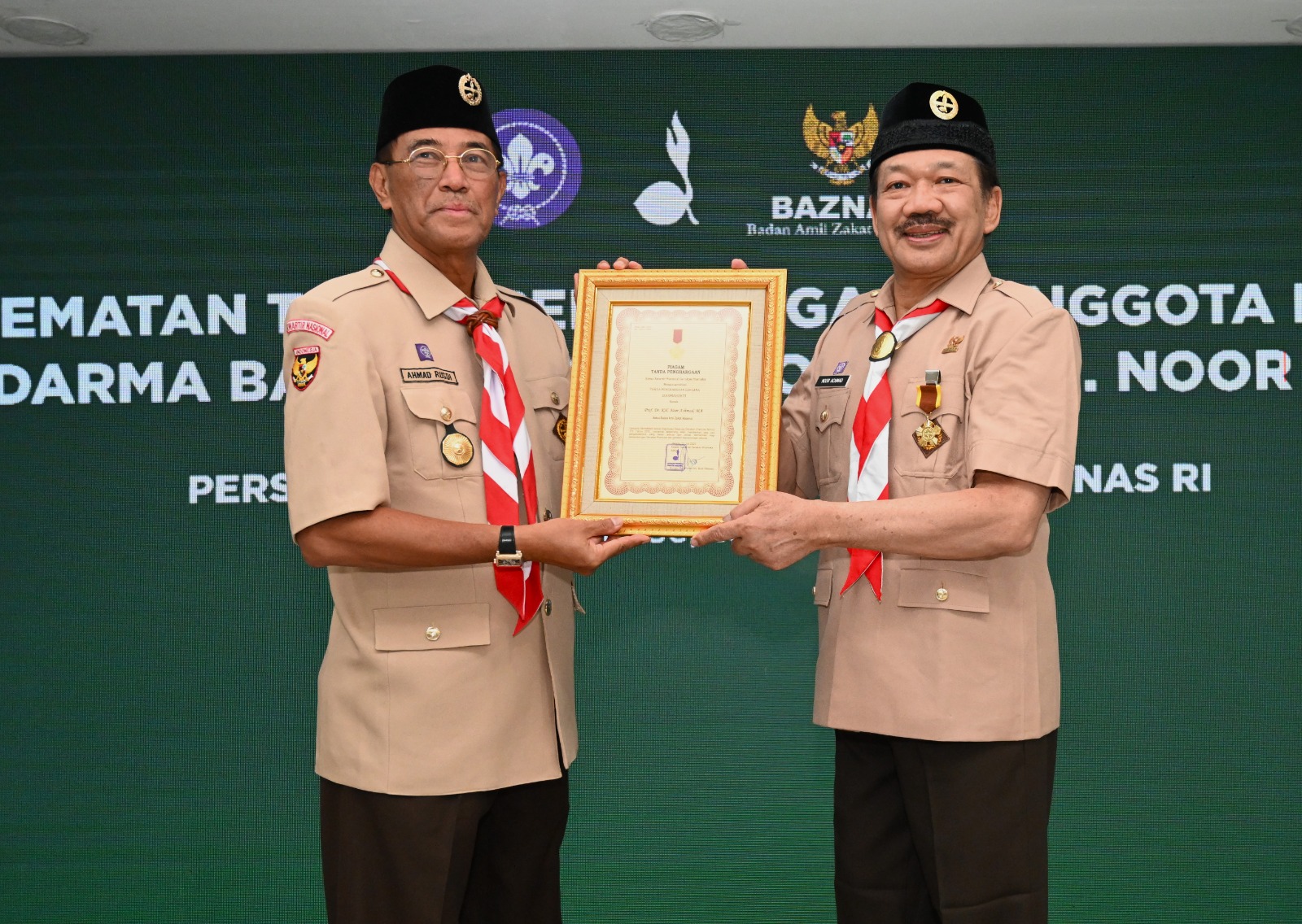 PRAMUKA.ID – Ketua Badan Amil Zakat Nasional Republik Indonesia (Baznas RI), Prof Dr. KH. Noor Achmad, MA menerima tanda penghargaan Gerakan Pramuka berupa Lencana Darma Bakti dari Kwartir Nasional Gerakan Pramuka. Acara penyerahan tanda penghargaan itu dilaksanakan di Kantor BAZNAS Pusat, Jl. Matraman Raya No: 134, Kb. Manggis, Jakarta Timur, Selasa (19/9/2023) siang oleh Wakil Ketua Kwarnas/Ketua Komisi Kerjasama Dalam dan Luar Negeri, Kak Ahmad Rusdi.