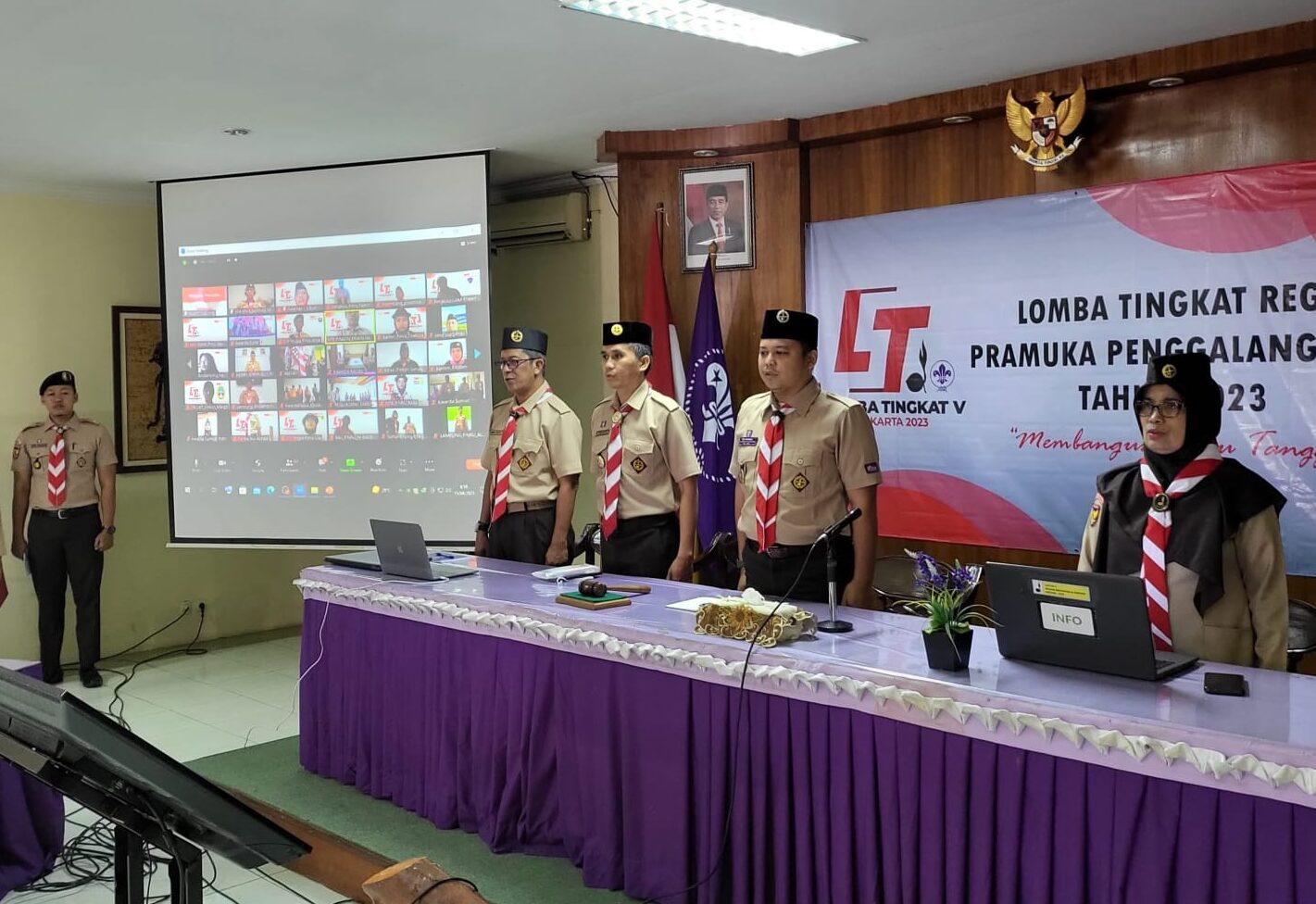 Yang hadir secara luring di Aula Pusdiklat Kwartir Nasional, Kak Rio Ashadi, Sekretaris Komisi Binamuda, Kak Irwan Febriansyah, Andalan Nasional Komisi Binamuda dan beberapa staf pendukung LT-V tahun 2023.
