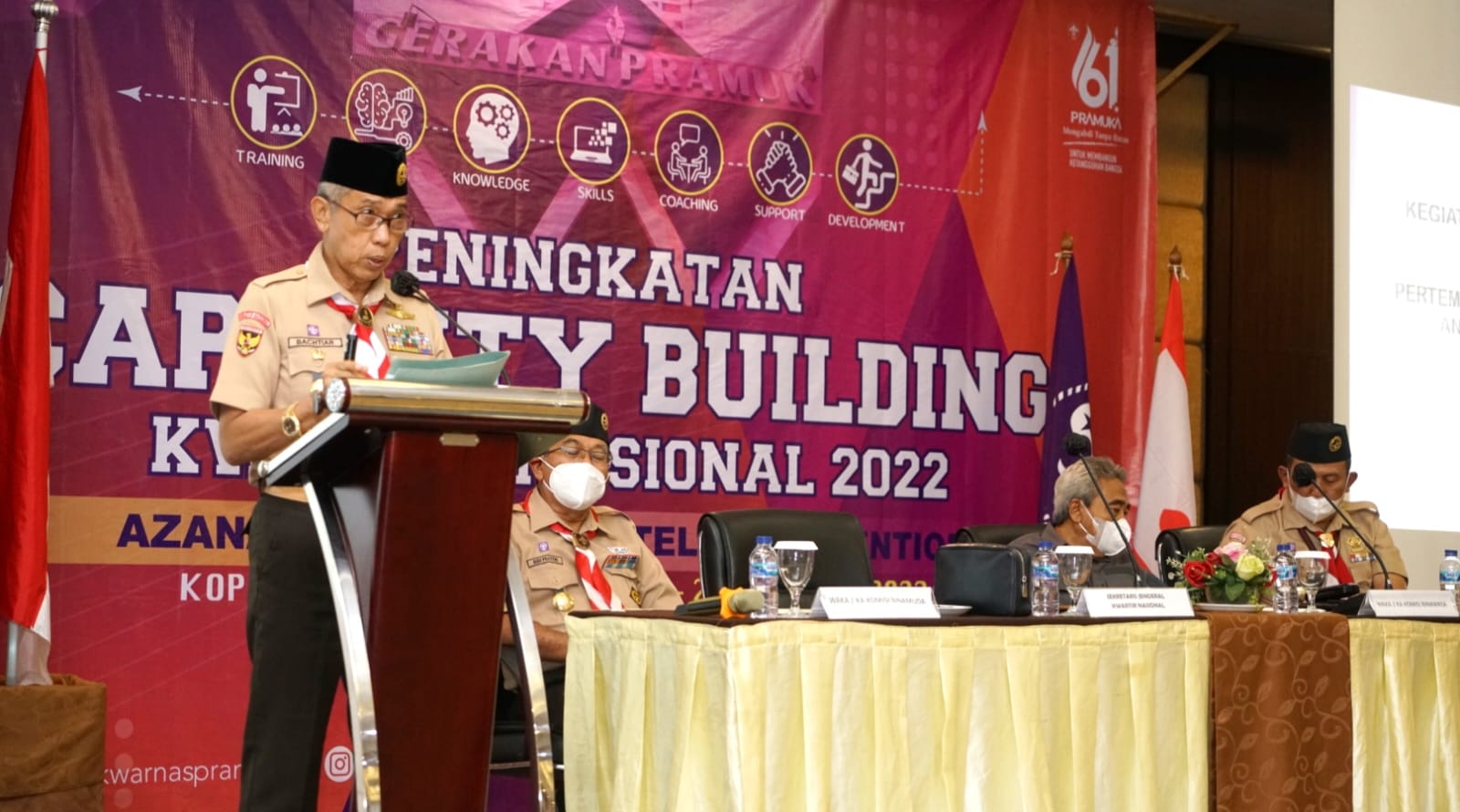 Staf Kwarnas tetap menjalankan organisasi meskipun Pimpinan dan Andalan Nasional silih berganti komposisinya dari masa bakti satu ke masa bakti lainnya, terang Ketua Kwarnas, Kak Budi Waseso dalam sambutannya yang dibacakan oleh Sekjen Kwarnas, Kak Dr. Bachiar, S.IP, M.AP saat membuka kegiatan Peningkatan Capacity Building Kwarnas Gerakan Pramuka dan Pertemuan Pokja Pembaharuan Kurikulum Anggota Gerakan Pramuka, di Azana Green Peak Resort Bogor, Jawa Barat, Selasa (27/12/2022) sore.