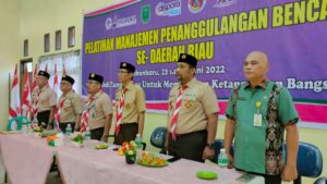 PRAMUKA.ID — Untuk meningkatkan kemampuan manajerial anggota Gerakan Pramuka dalam penanggulangan bencana, Kwartir Daerah (Kwarda) Gerakan Pramuka Riau selenggarakan Pelatihan Manajemen Penanggulangan Bencana se-Daerah Riau selama 4 hari mulai tanggal 23 s.d 26 Juni 2022 bertempat di Bumi Perkemahan Pusdiklatda Riau.
