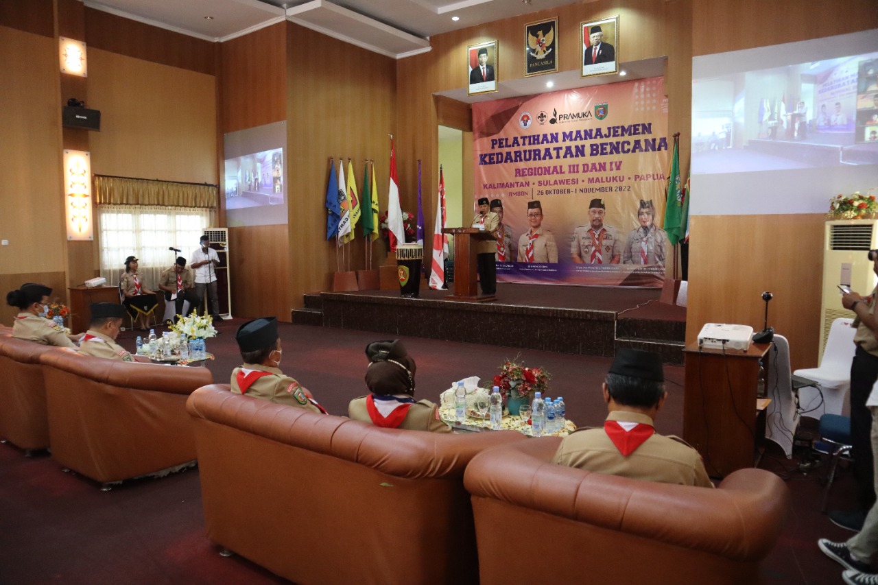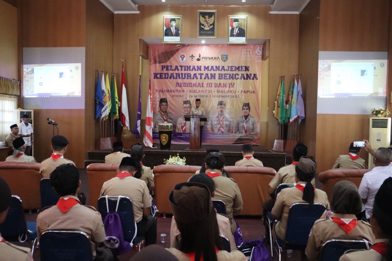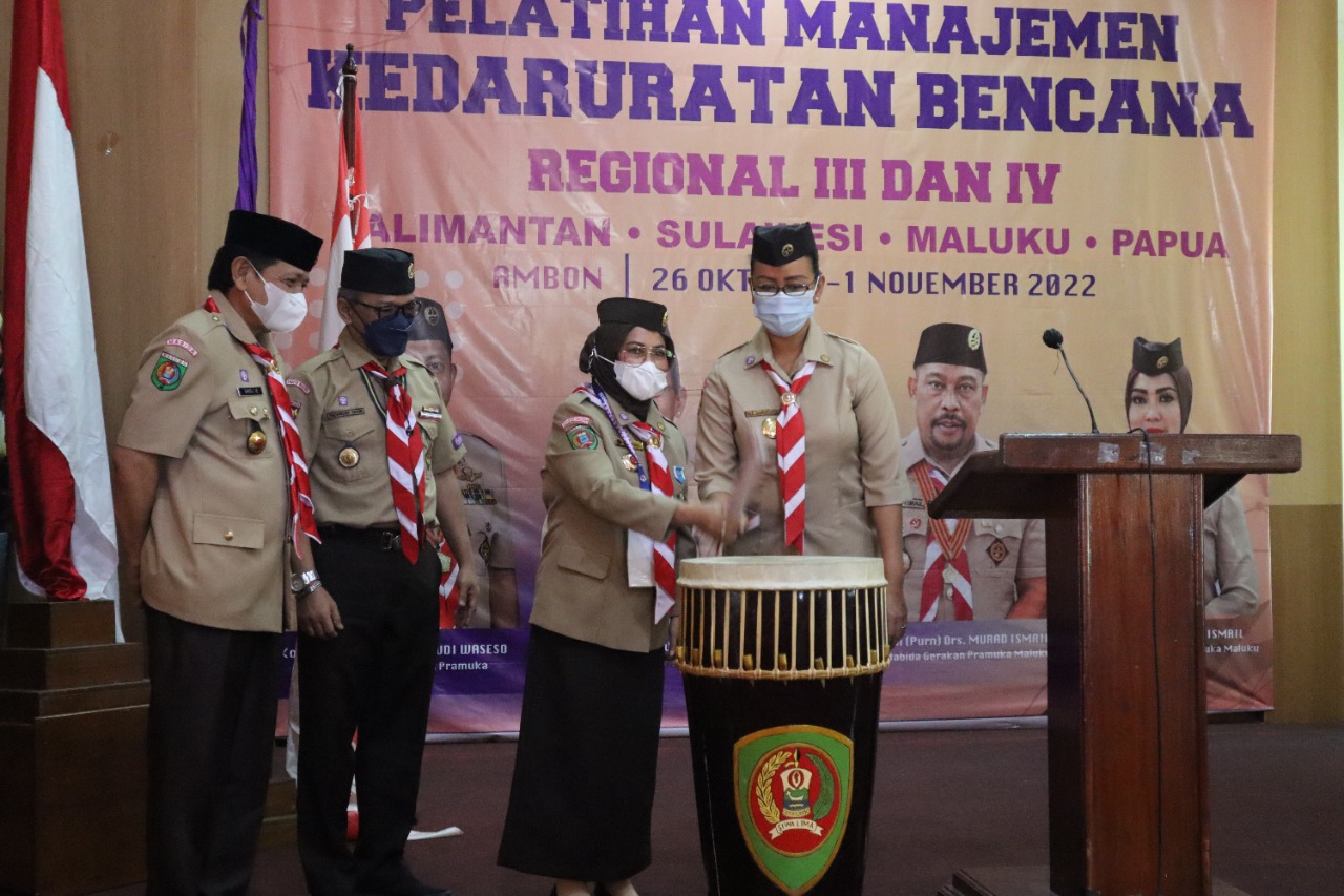 Acara Pelatihan Manajemen Kedaruratan Bencana (PMKB) Regional III dan IV dibuka secara resmi oleh Wakil Ketua Kwarnas/Ketua Komisi Pengabdian Masyarakat, Kak GKR Mangkubumi, Rabu, (26/10/2022) di Aula Balai Penjaminan Mutu Pendidikan Provinsi Maluku, Jl. Tihu Wailela Rumah 3, Tihu, Kec. Teluk Ambon, Kota Ambon, Provinsi Maluku.