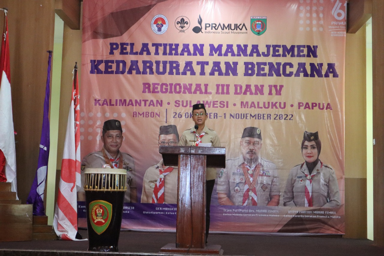 PRAMUKA.ID – Kwartir Nasional Gerakan Pramuka menyelenggarakan Pelatihan Manajemen Kedauratan Bencana PMKB Regional III (Kalimantan, Sulawesi) dan Regional IV (Maluku, Maluku Utara, Papua, Papua Barat) tanggal 26 Oktober – 1 November 2022 di Kota Ambon, Provinsi Maluku. Pelatihan diikuti 45 peserta dari unsur anggota relawan Pramuka Peduli utusan Kwartir Daerah Regional III  dan regional IV.