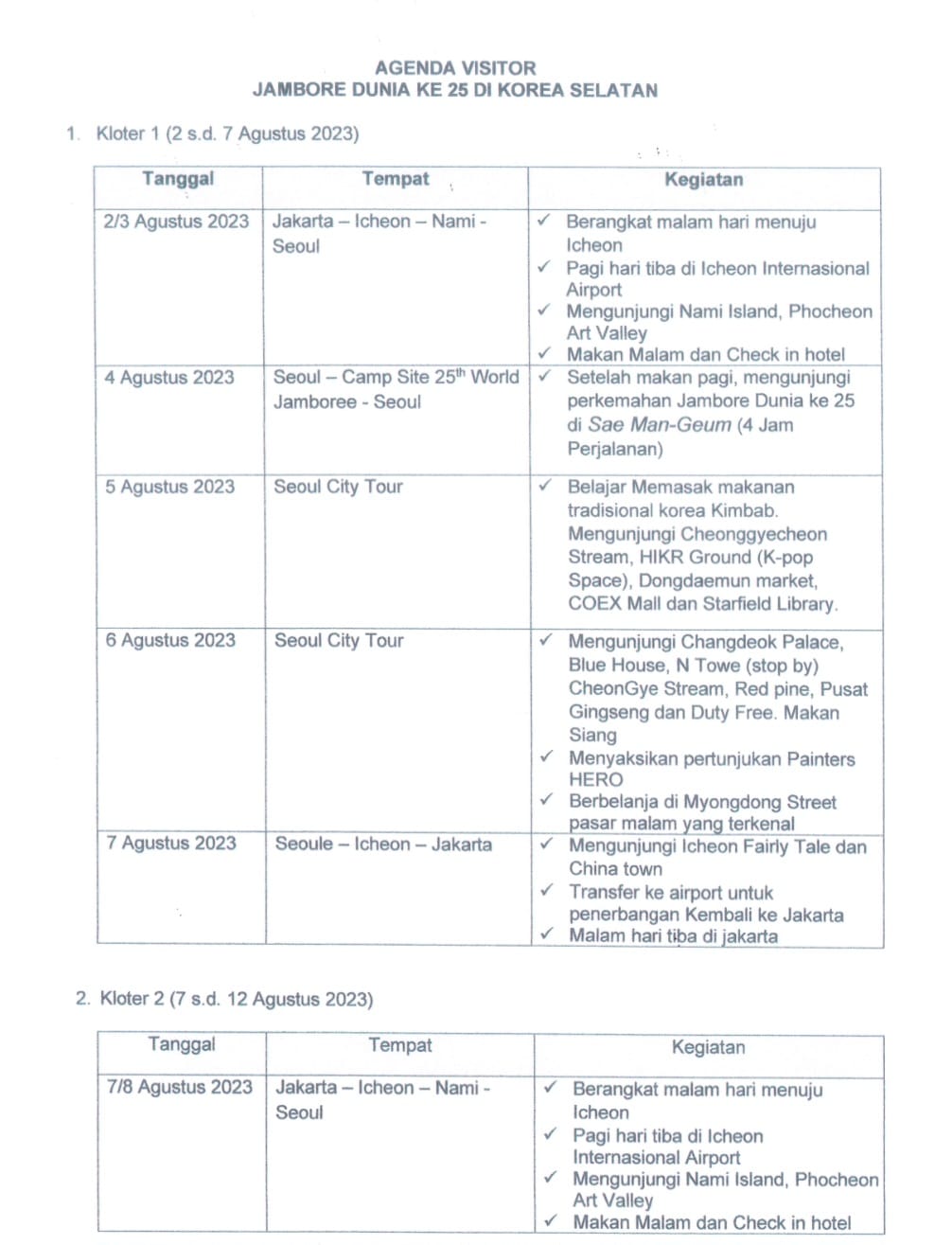 Surat edaran yang dikeluarkan Kwartir Nasional itu adalah untuk memberitahu kepada calon visitor Jambore Dunia yang tentunya dengan opsi-opsi penawaran kepada semua yang ingin menjadi visitor.Seperti yang diberitakan sebelumnya, bahwa Kwartir Nasional Gerakan Pramuka akan berpartisipasi mengirimkan Anggota Gerakan Pramuka ke Jambore Dunia ke-25, 25th World Scout Jamboree 2023 bertempat di Saemangeum, Korea Selatan pada tanggal 1-12 Agustus 2023.