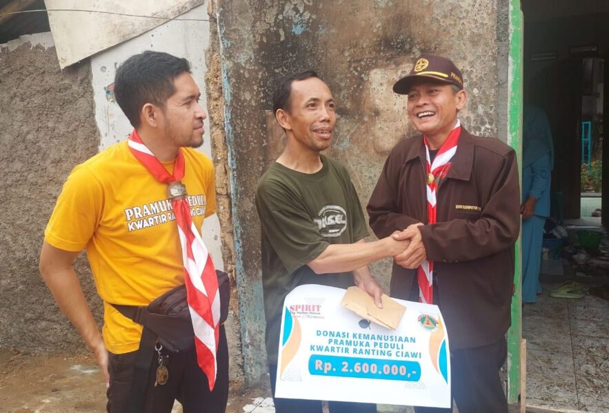 Bantuan berupa uang tunai, bahan makanan dan pakaian layak pakai diserahkan langsung oleh Kak Herman selaku Wakil Ketua Kwarran bidang Usaha, Kerjasama dan Pengabdian Masyarakat didampingi oleh beberapa Andalan dan Pramuka Peduli Unit Kwartir Ranting Ciawi.