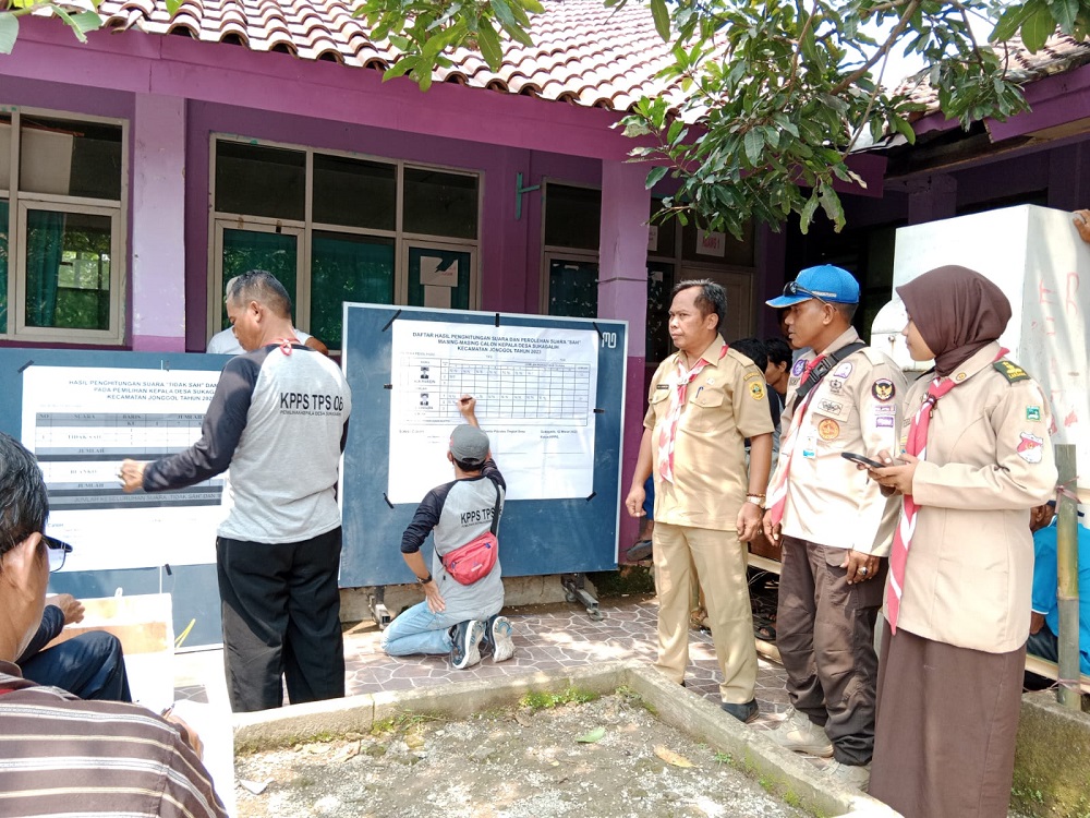 PRAMUKA.ID — Gerakan Pramuka Kwartir Ranting Jonggol menurunkan anggotanya untuk membantu pengamanan pelaksanaan pemilu kepala desa (Pilkades) Serentak Gelombang II Kecamatan Jonggol pada Minggu (12/3/2023).