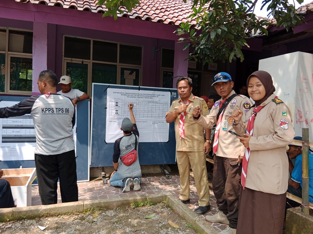 PRAMUKA.ID — Ketua Kwarran Jonggol Kwarcab Kabupaten Bogor menurunkan anggota pramuka untuk membantu pengamanan pelaksanaan pemilu kepala desa (Pilkades) Serentak Gelombang II Kecamatan Jonggol pada Minggu (12/3/2023).