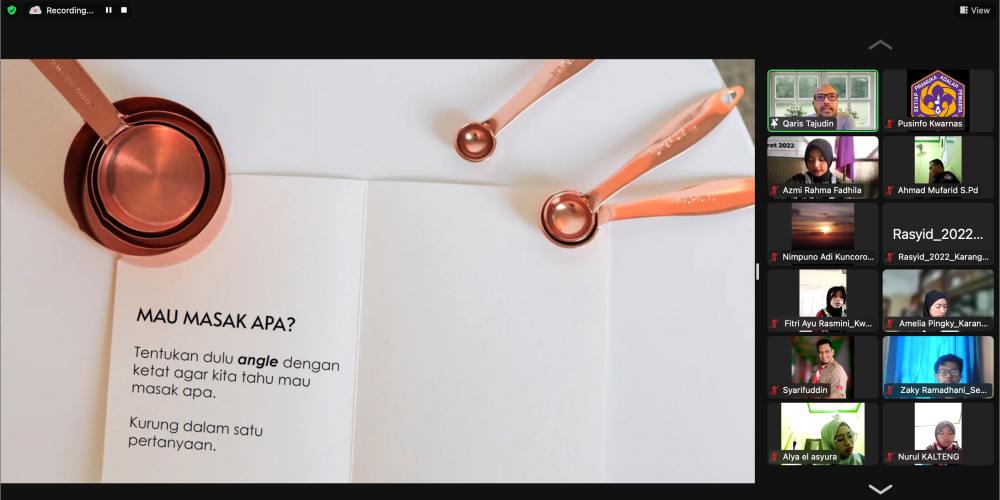 Terkait dengan analogi memasak, dalam menulis Kak Qaris mengajak peserta untuk dapat menentukan angle. Misalnya Memasak Apa? Yaitu dengan cara membuat satu pertanyaan dan kita bisa menjawab secara detail dari pertanyaan tersebut.