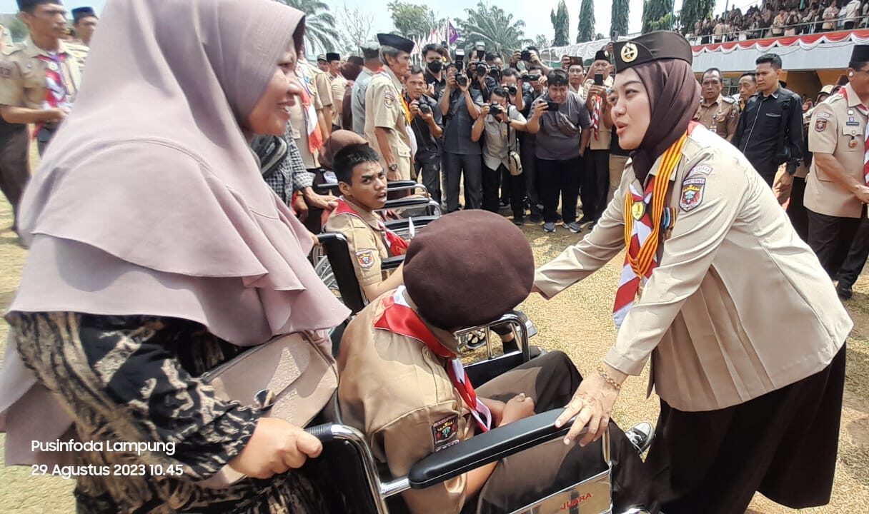 PRAMUKA.ID – Ketua Kwarda Gerakan Pramuka Lampung, Kak Chusnunia menyerahkan bantuan Pramuka Peduli kepada masyarakat saat moment Apel Besar Hari Pramuka ke-62 Tahun 2023, Selasa (29/8/2023) pagi di Stadion Sukung Kotabumi Lampung Utara.