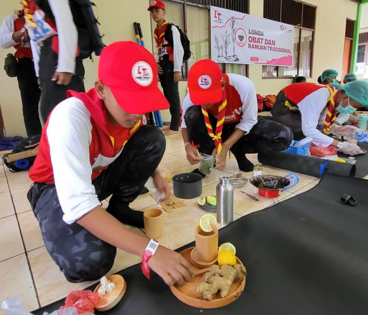 Gilang yang mewakili Regu Kuda Hitam, peserta LT-V dari kongtingen Kwarda Banten yang ikut di Lomba Ramu Obat Tradisional ini membuat ramuan obat batuk dengan bahan jahe, Lemon dan daun Karuk