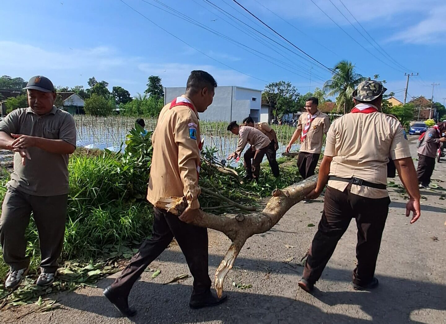 Sebanyak 24 personil Pramuka Peduli bergabung bersama masyarakat setempat, Pemerintah Desa, Kecamatan, TNI, dan Polri, mereka bahu-membahu membersihkan sisa-sisa pohon tumbang dan merapikan bangunan yang rusak.