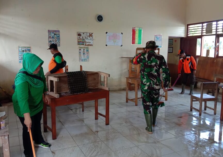 “Kejadian banjir dua hari yang lalu meninggalkan genangan air dan lumpur sehingga perlu kami bersihkan dengan harapan, nanti kalau anak-anak kembali masuk sekolah akan merasakan nyaman”. Ungkap Kak Lilik.