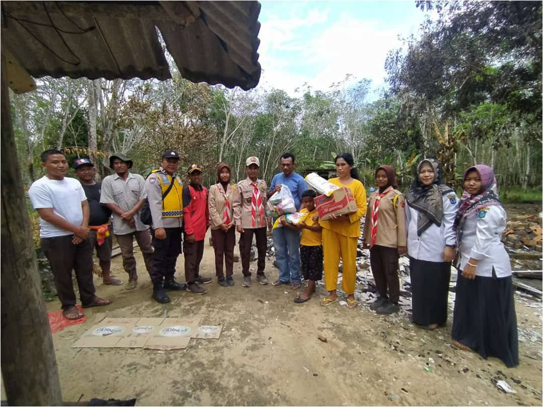 PRAMUKA.ID — Bakti Sosial (Baksos) Saka Bhayangkara Pangkalan Polses Mesuji Raya memberikan bantuan sembako kepada salah satu keluarga di Desa Balian Makmur yang rumahnya mengalami kebakaran total di Desa Balian Makmur, Mesuji Raya Kabupaten OKI, Sumatera Selatan, Minggu (22/01/2023).