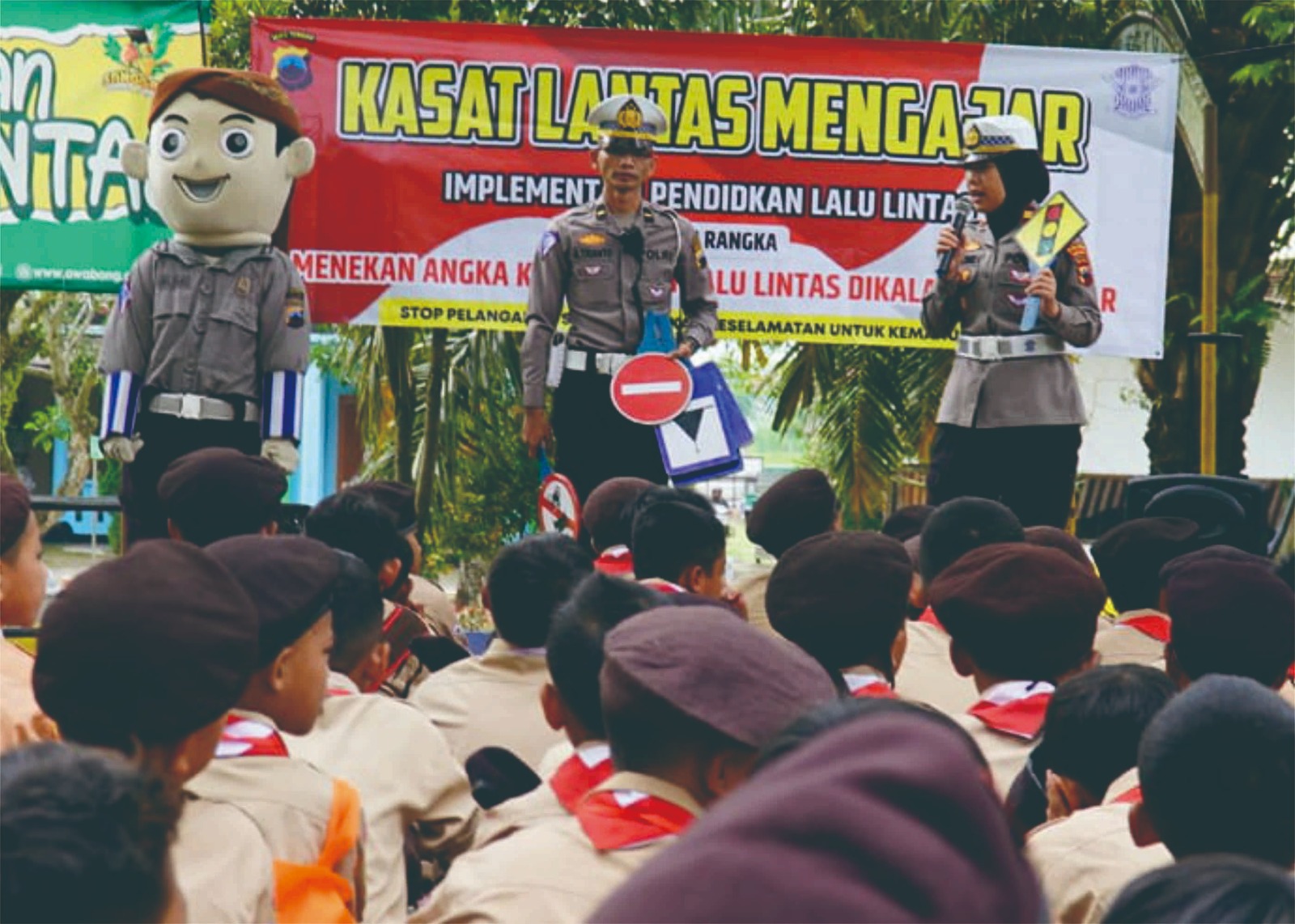 “Adik-adik harus berani mengingatkan bapak dan ibunya ya, jika berkendara dengan sepeda motor, harus membawa SIM, STNK, spionnya juga harus lengkap. Jangan lupa pakai helm. Adik-adik juga harus pakai helm kalau membonceng,” katanya.